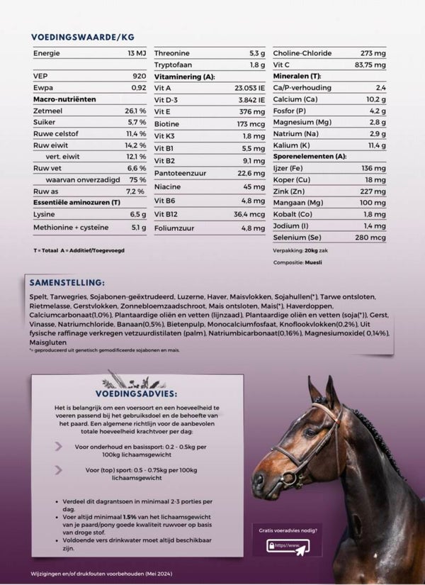 Luxe muesli met een unieke combinatie van langdurige én explosieve energie ter ondersteuning van zowel cardio- als ook krachttraining. Bevat daarnaast o.a. extra hoogwaardige eiwitten en aminozuren voor spieropbouw, en Gastro+ ter ondersteuning van een gezonde maag.