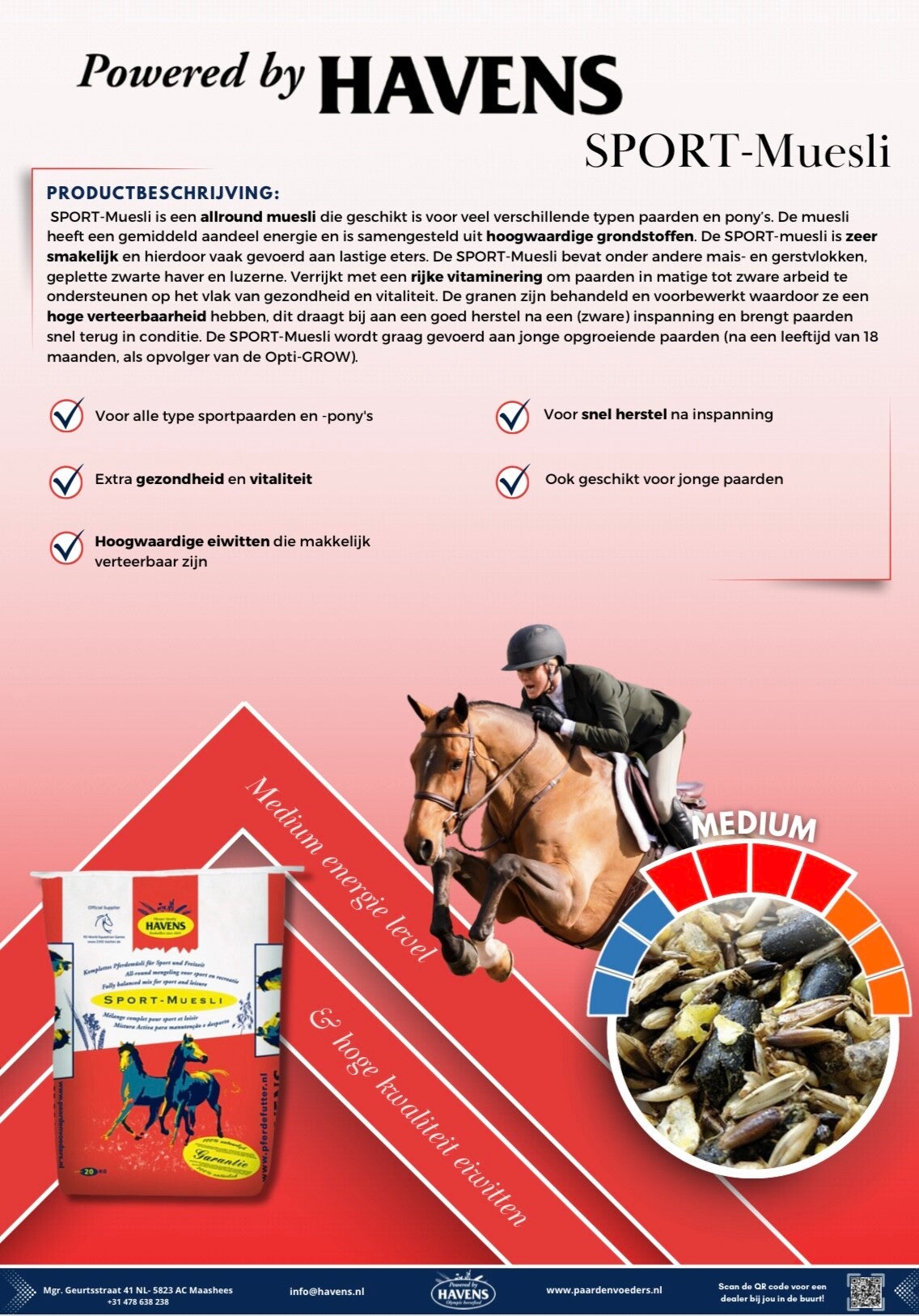 Complete allround paardenmuesli met een hoge verteerbaarheid voor sport en prestatie. Geschikt voor alle typen sportpaarden. Ter ondersteuning van paarden tijdens herstelperiodes na zware inspanning. Daarnaast helpt het de natuurlijke weerstand te versterken en om dieren in goede vorm te behouden. 20kg/zak